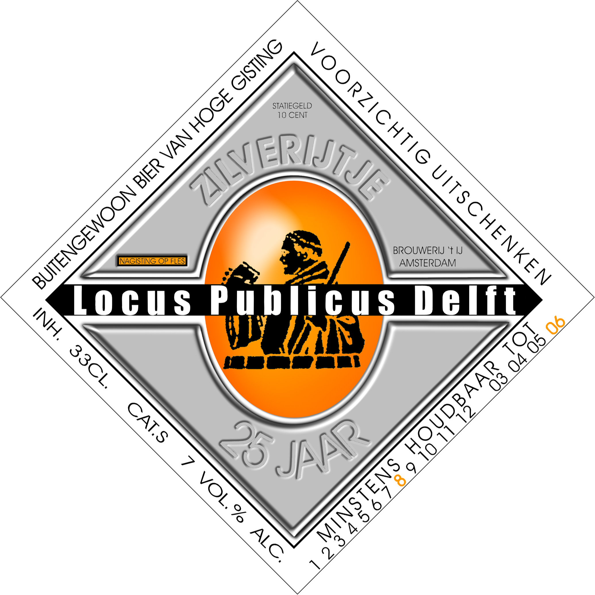 Etiket voor een jubileum bier van speciaalbiercafe Locus Publicus te Delft. Dit bier is gebrouwen door brouwerij 't IJ, en het etiket is in de stijl